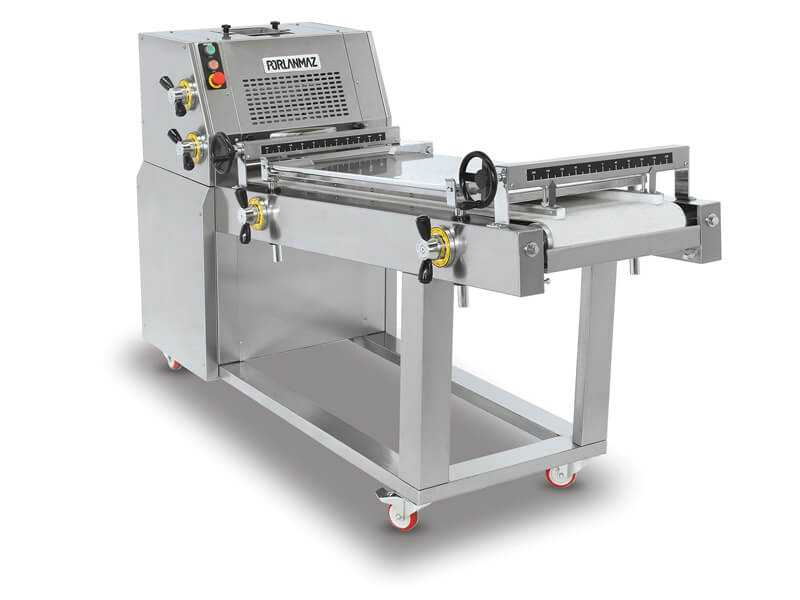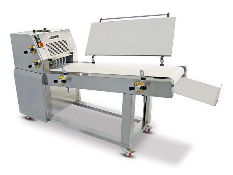 Тестозакаточная машина производит закатку заготовки из теста. Тесто закатывается и ему придается форма при помощи двух независимо регулируемых закаточных плит. Вторая закаточная плита может быть как ровной (для минибагетов), так и волнистой (для батонов). Максимально возможная длина заготовки до 420 мм. Предварительно раскатанная тестовая заготовка заворачивается в рулон, и, проходя под закаточной плитой, формуется в заготовку цилиндрической формы заданной длины и диаметра. Процесс происходит без разрывов, напряжения и стресса для теста. Регулировка по ширине. Работает бесшумно и без вибрации. Экономный расход электроэнергии. Легкая чистка и обработка деталей.