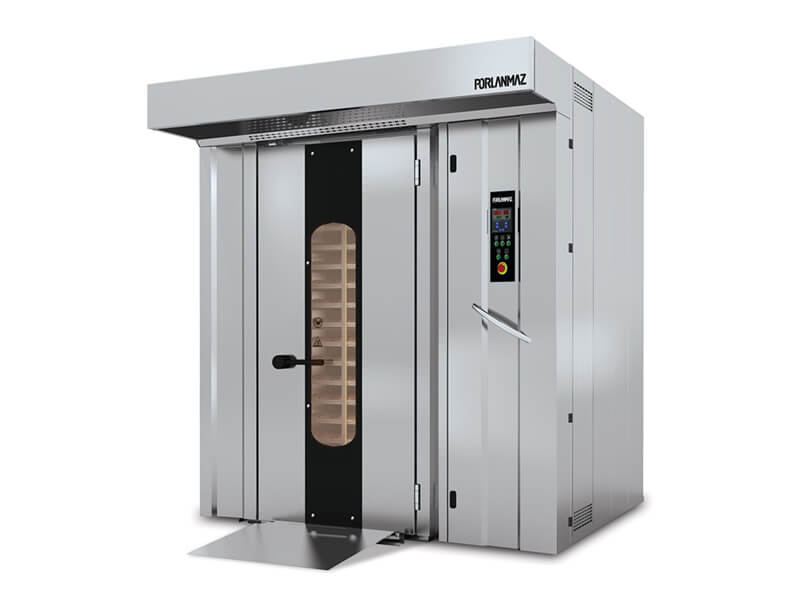 Ротационные хлебопекарные печи используют для приготовления сразу две функции: конвекция и ротация. Ротационные печи обеспечивают высококачественную выпечку хлеба, булочек, кексов, коржей, бисквитов, печенья, пироженых, круассанов и т.д. Новейшая технология разработки тепла в камере, по сравнению с классическими моделями, позволяет больше подачи пара в камеру выпечки. Это дает возможность экономной и равномерной выпечки. В новой системе, пар вырабатывается в профилях, которые находятся внутри печи и снабжают каждый подовой лист нужным количеством пара. Камера сгорания сделана из нержавеющей стали, частный сплав с выносливостью больше 1000 сантигратных градусов тепла. Освещение установлено на двери кабины печи. Лампы можно с легкостью поменять снаружи. В печах рекомендуется применять смягченную воду. Особенность печи в том, что горелка расположена в передней части.